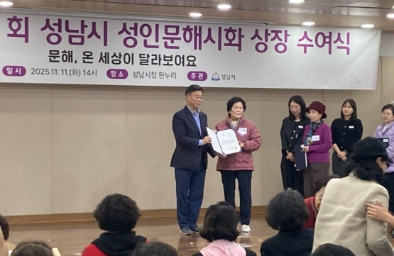 「제12회 성남시 성인 문해 시화전」 전시•상장수여식이 2025년 11월 11일 오후2시 에 성남시청 3층 한누리 홀에서 진행되었습니다. 본 복지관 한글교실 김OO어르신의 작품 "미안하다 이제야 쓰는 말"이 배움상으로 선정되어 성남시장상을 수상하였습니다. 그리고 본 복지관 한글교실 시화출품작중 5개의 작품이 전시작품으로 선정되어 1층 누리홀에서 시화전 작품 전시를 하였습니다.